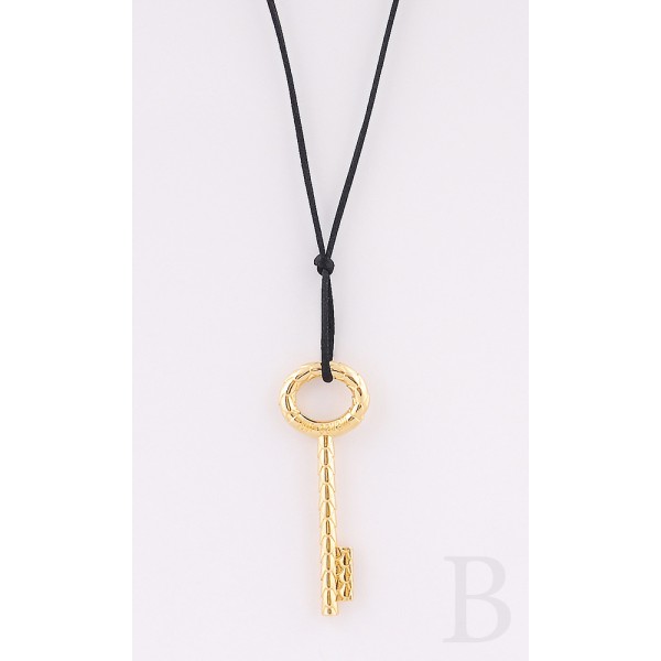 Eπίχρυσο σε σχήμα κλειδί,περασμένο σε μεταξωτό μαύρο κορδόνι.